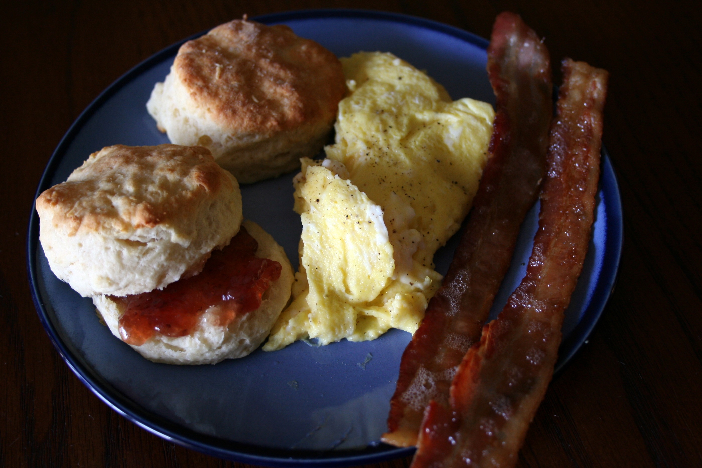 It’s been pretty quiet in my kitchen this past week. M got rear-ended on Monday and the weekly routine was effected by it. I have done some cooking here and there, but no pictures. Last night I decided that I would try to make some biscuits for breakfast to sit along side some scrambled eggs and bacon. Pretty simple, but that’s all I had in the fridge. I haven’t gone grocery shopping all week, but I knew I had the ingredients to make some of these. I found the recipe this morning on Food Network’s website. It seemed simple enough and I was happy to see that the recipe wouldn’t yield a ton of biscuits! I don’t have anything to compare these to but they are nice and light. Speaking of light, you don’t want to over work the biscuit dough and your wet ingredients should be pretty cold. While I prepped the dry ingredients, my buttermilk, butter and shortening were chilling out in the freezer. Thanks for reading, enjoy!