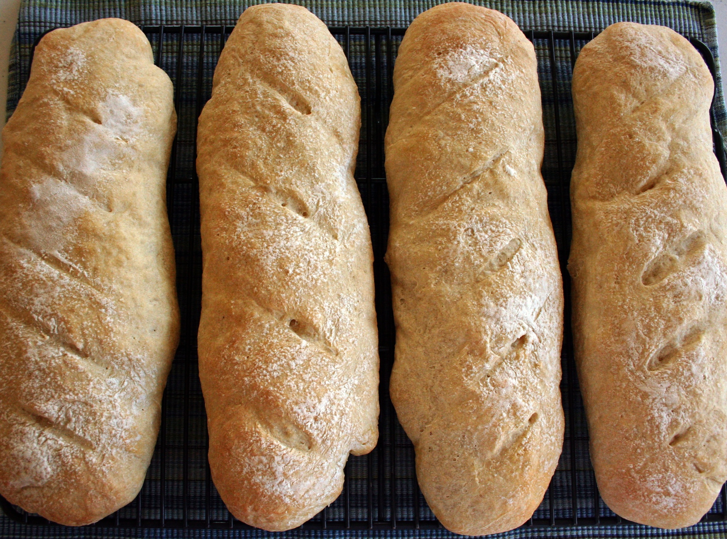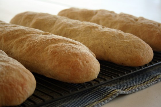 Verdict: These came out light colored, but they did bake through all the way. It’s hard for me to resist leaving loaves in longer than the recommended amount of time when this happens. There is hardly any fat in this recipe – only 2 teaspoons of olive oil, so they probably aren’t meant to be any darker than this. The interior was nice and light with big bubbles and a thin, crisp crust and they held up well to our sandwich filling. Overall, I’m happy with how these turned out but I’m sure I’ll find an excuse to try a new recipe soon. Thanks for reading, enjoy!