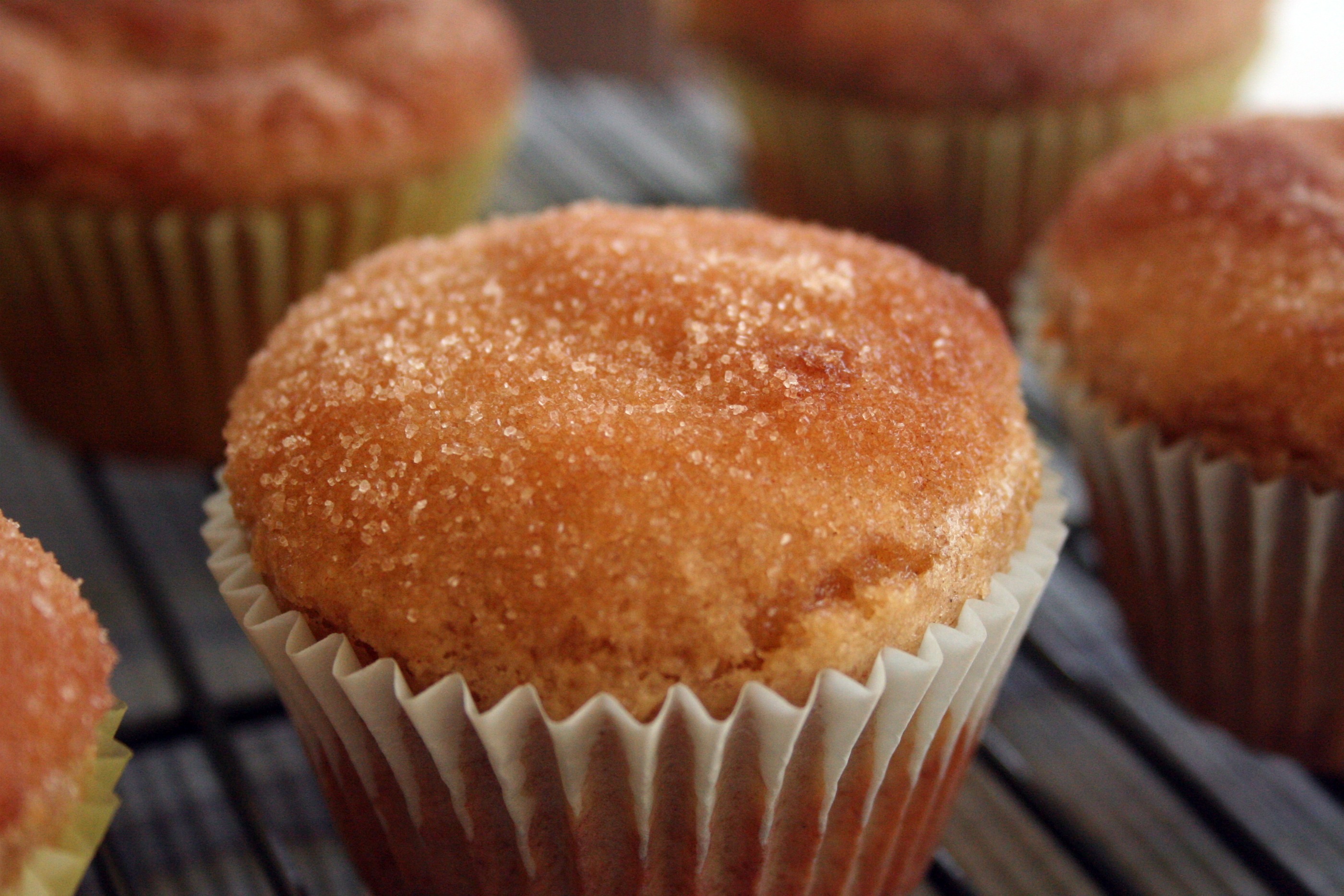 While the muffins are baking, melt 1/2 stick butter and place in a bowl just large enough to hold a muffin. Combine ½ cup of sugar and 1 tsp. cinnamon in a small, shallow bowl. As soon as the muffins are done, dip them one at a time in the melted butter and then roll in the sugar mixture. Set on a rack to cool.