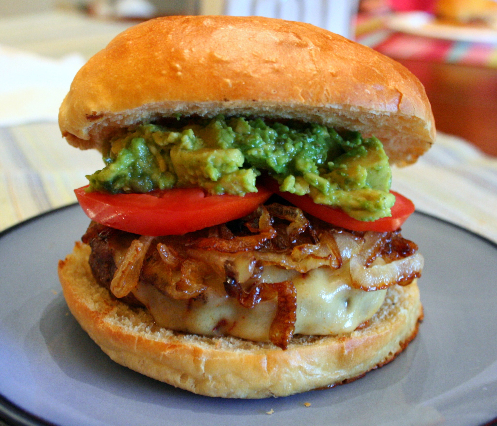Yum – hamburgers with caramelized onions, chipotle Gouda, avocado, and tomato…so good. Up until today, I have never caramelized onions before, but it couldn’t be easier. If you have 15 minutes, onion and olive oil – you’re golden! Just be sure to stir them around every once in a while so they brown evenly. My house smells amazing and I am going to have to make these every time we make hamburgers now – for the smell alone! 😉 Oh, and if that wasn’t enough to make these burgers special, I made brioche buns. These are light, fluffy and slightly sweet buns enriched with eggs, butter and sweetened with honey. The dough is pretty sticky but so light and pillow soft. These burgers had so many flavors going on – sweet, salty, savory and spicy. I am so hooked on caramelized onions now, I’m going to have to find more ways to use them. Thanks for reading, enjoy!