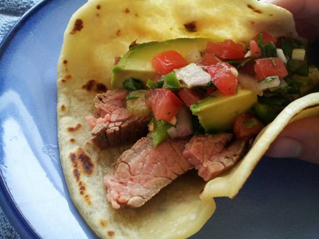 2. Heat up some warm soft flour tortillas, layer with thinly sliced strips of the Cilantro-Lime Steak, shredded iceberg lettuce, Salsa Fresca and top with shredded Monterey Jack cheese.