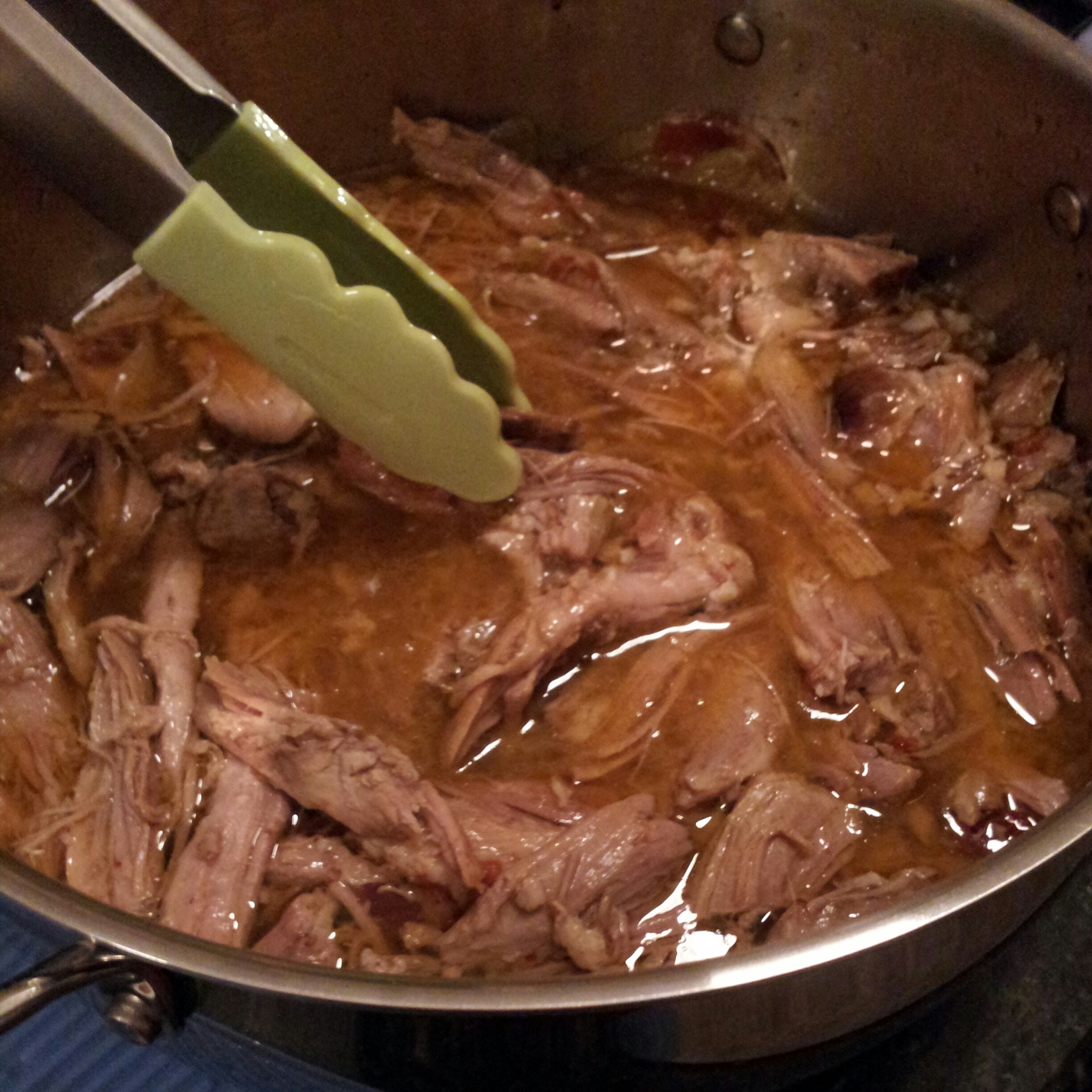 Remove meat from pot and place on a cutting board or other work surface. Use two forks to shred meat, discarding large pieces of fat. Strain as much of the fat off the top of the cooking liquid as you can and discard it. Return the shredded meat to the cooking liquid, and keep warm until ready to serve.