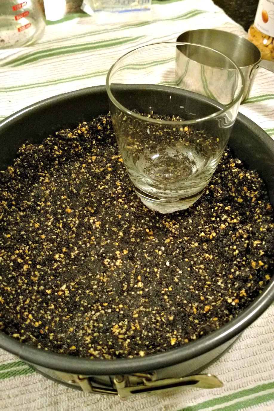 To Make The Crust: Combine crushed Oreo cookies and peanuts that have been ground in a food processor with the melted butter. Pat the crust mixture onto bottom and sides of a 10-inch springform pan.