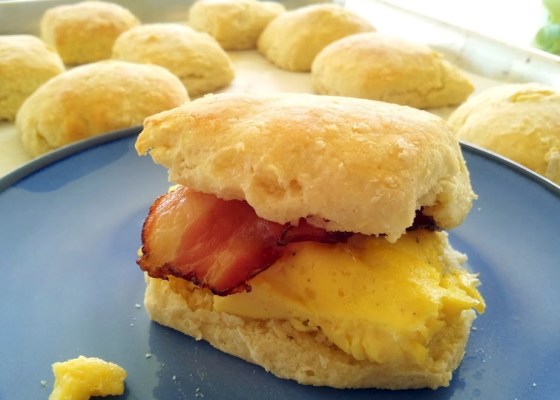 The kids let us sleep in this morning, which was a happy surprise. However, it meant that it was nearly “brunch time” by the time we rolled out of bed. Everyone wanted breakfast and had their own ideas of what it should be. One wanted pancakes, the other expected French toast – another suggested outside options. In an effort to avoid that, I remembered this recipe, and that I had the all important eggs and bacon! These biscuits came together quickly and were so easy to make. I cut the biscuits into squares to save time and avoid overworking the dough and piecing the scraps together to make more biscuits. We enjoyed these sandwich style, but my favorite way is with butter and apricot preserves 🙂