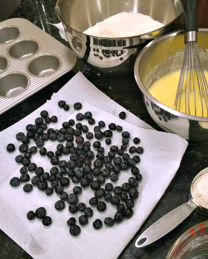 4. In the same bowl where you combined flour, add blueberries and toss them in 2 tablespoons of flour. This will help prevent blueberries from sinking.