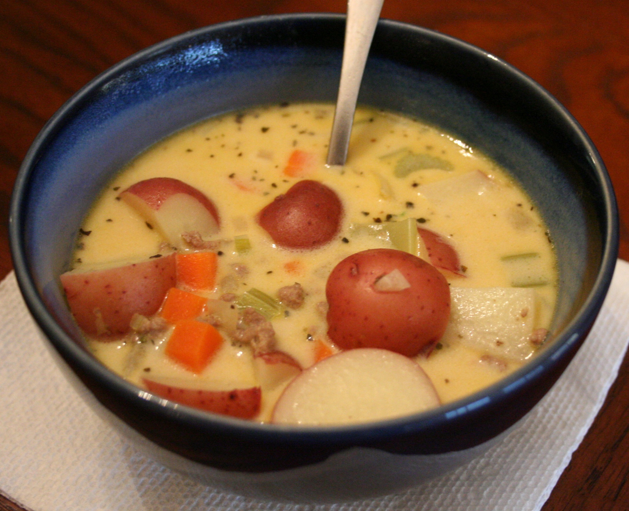 - Bring to a boil; reduce heat and simmer until potatoes are tender, about 12-15 minutes. Stir in chicken and cheese, a handful at a time, until smooth, about 1-2 minutes; season with salt and pepper, to taste. If the chowder is too thick, add more milk as needed.