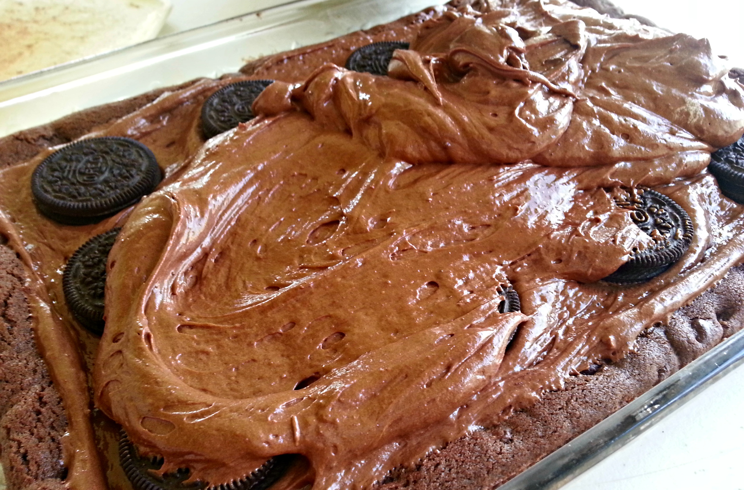 Pour half of the brownie batter on top of the cookie crust, then evenly space out the Oreo cookies; then pour the rest of the brownie batter over all and spread evenly across the top of the Oreos. Bake for 25-30 minutes.
